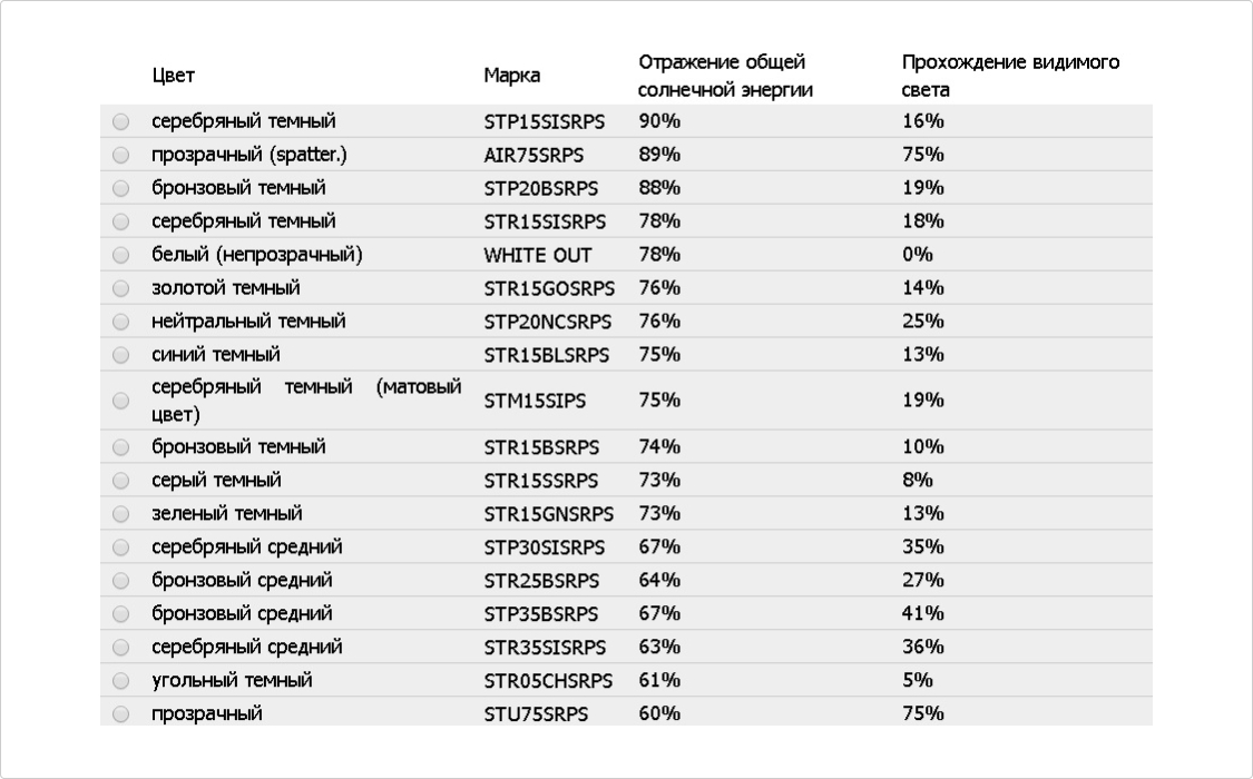 Табл.сравнения характеристик различных марок тонировочных пленок